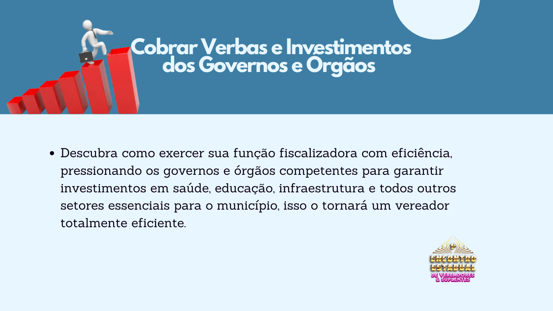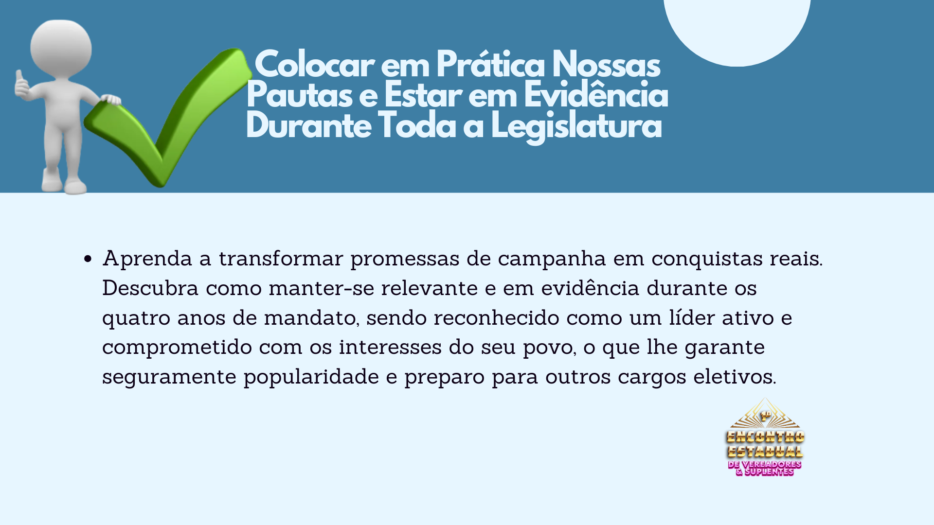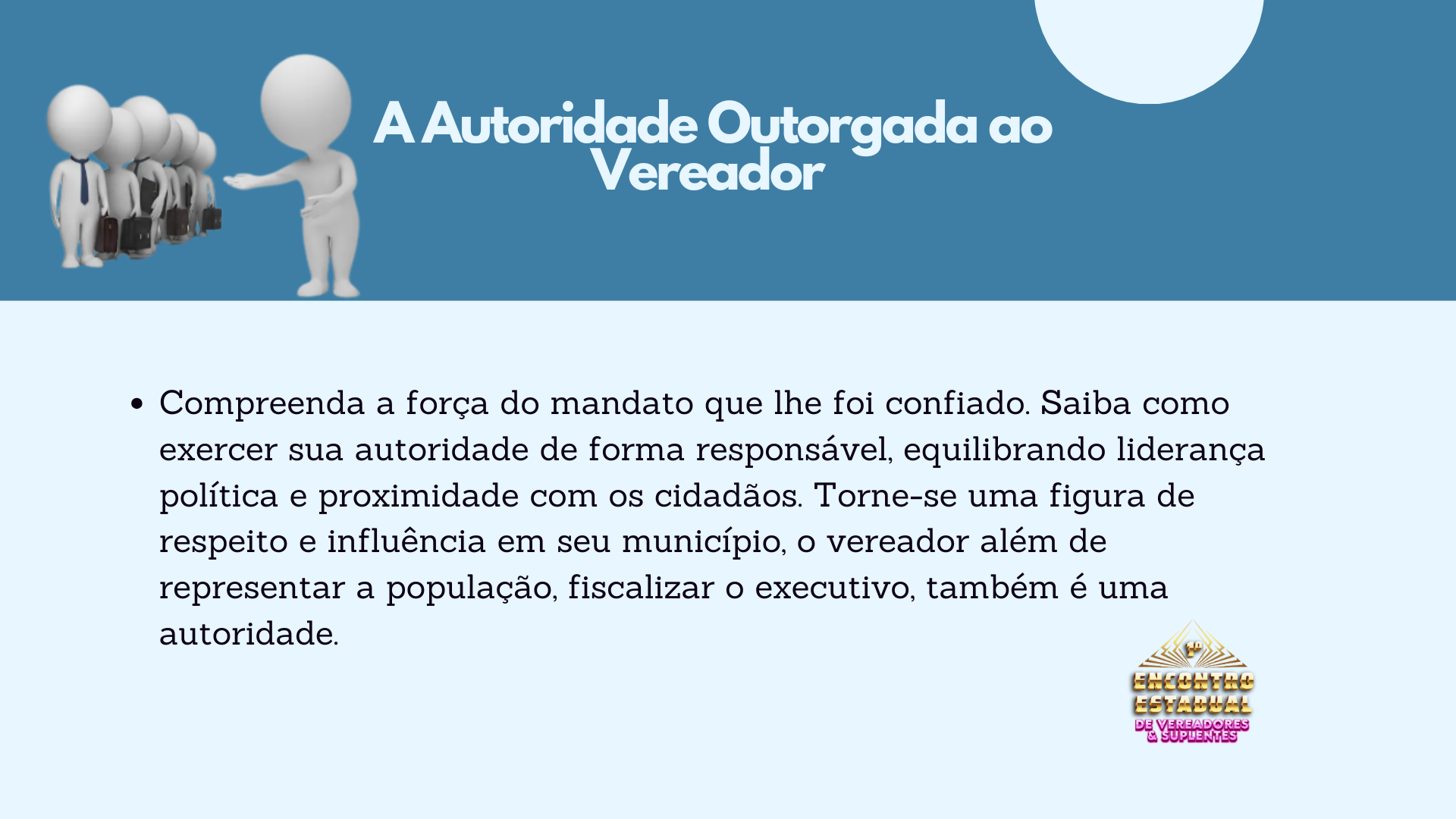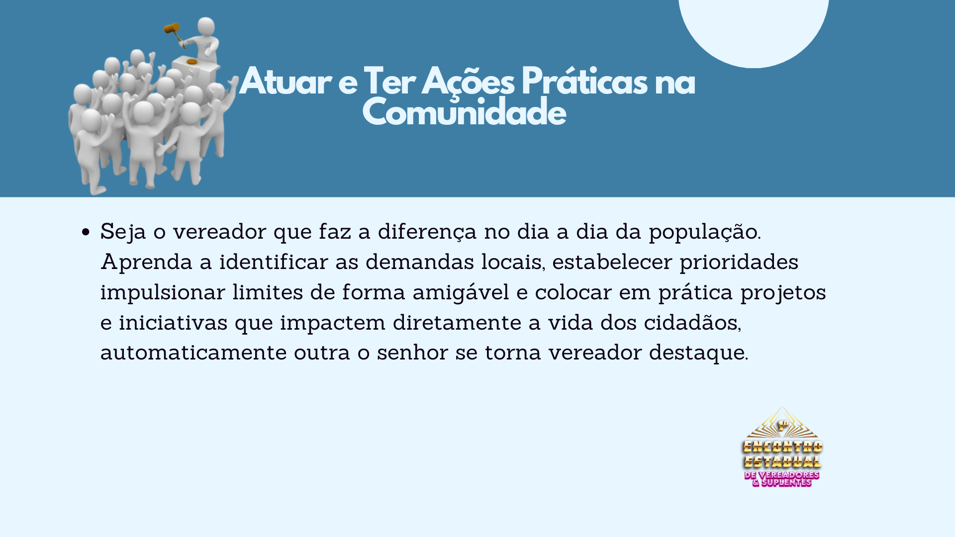 Em apenas um dia, os participantes aprenderão estratégias, técnicas e conhecimentos que levariam de cinco a oito anos para serem adquiridos no dia a dia. Este é o momento de se preparar para ser mais do que um vereador. Este é o momento de ser O Vereador – um líder reconhecido por sua excelência, visão e resultados.