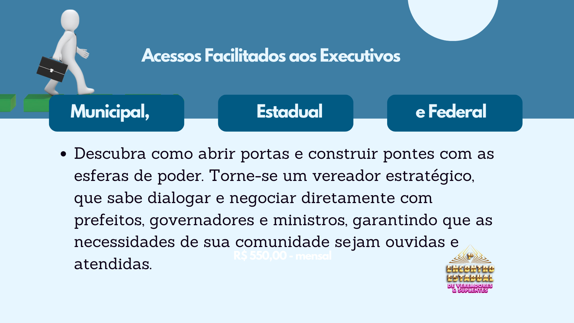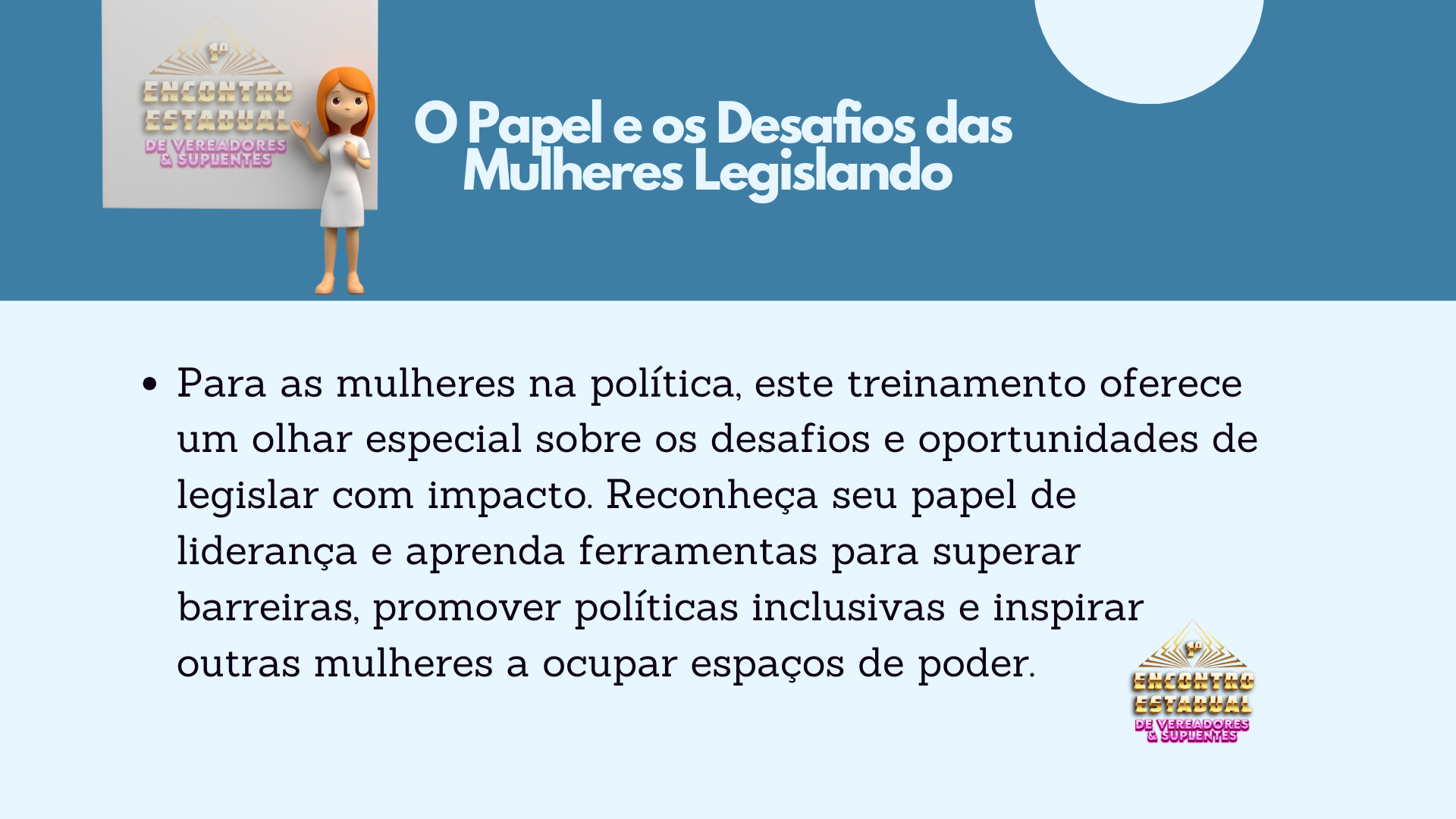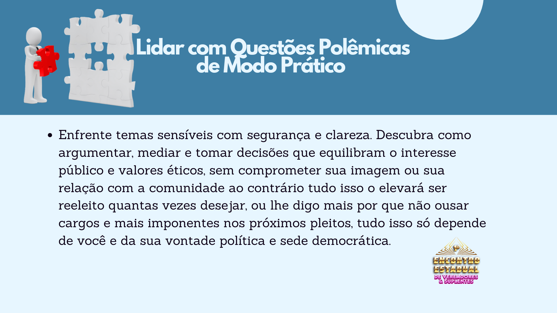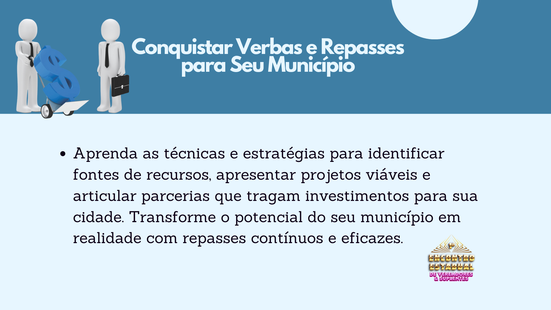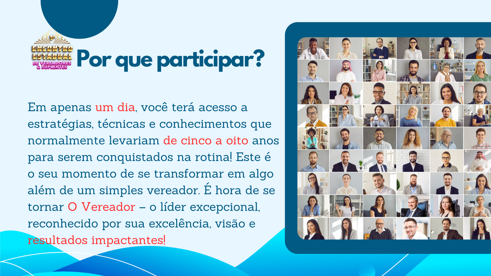 Em apenas um dia, os participantes aprenderão estratégias, técnicas e conhecimentos que levariam de cinco a oito anos para serem adquiridos no dia a dia. Este é o momento de se preparar para ser mais do que um vereador. Este é o momento de ser O Vereador – um líder reconhecido por sua excelência, visão e resultados.
