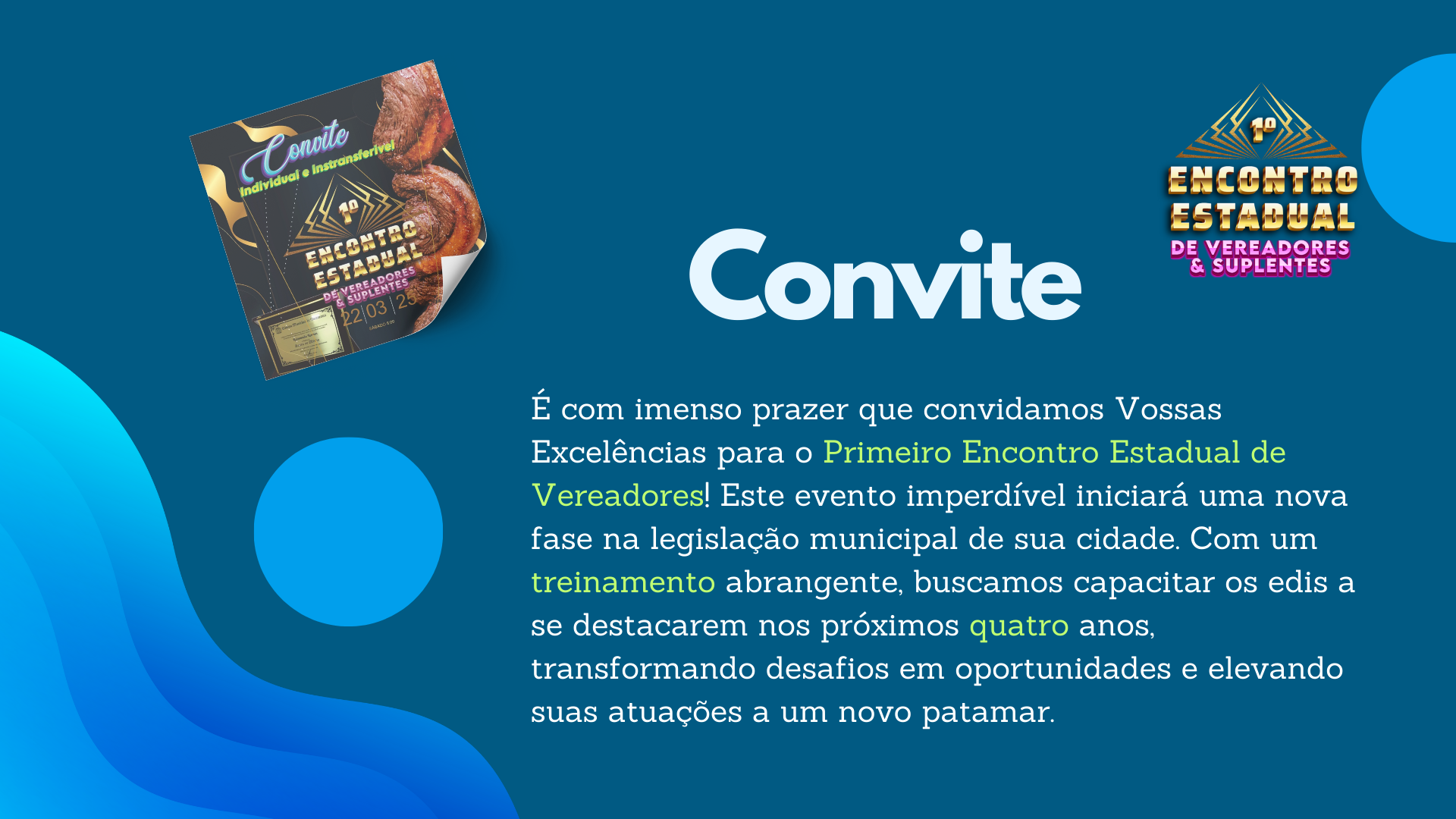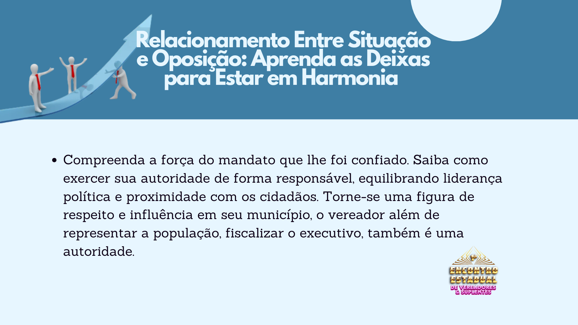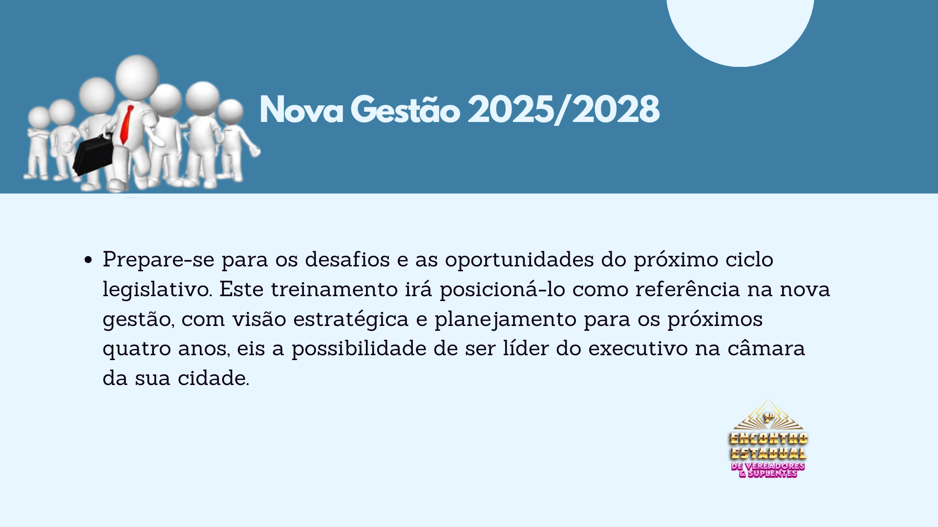 É com grande entusiasmo que convidamos Vossas Excelências para o Primeiro Encontro Estadual de Vereadores, um evento imperdível que marcará o início de uma nova era na gestão municipal. Este mega treinamento foi especialmente desenvolvido para capacitar os edís a se destacarem durante os próximos quatro anos de mandato, transformando desafios em oportunidades e elevando o nível de suas atuações.