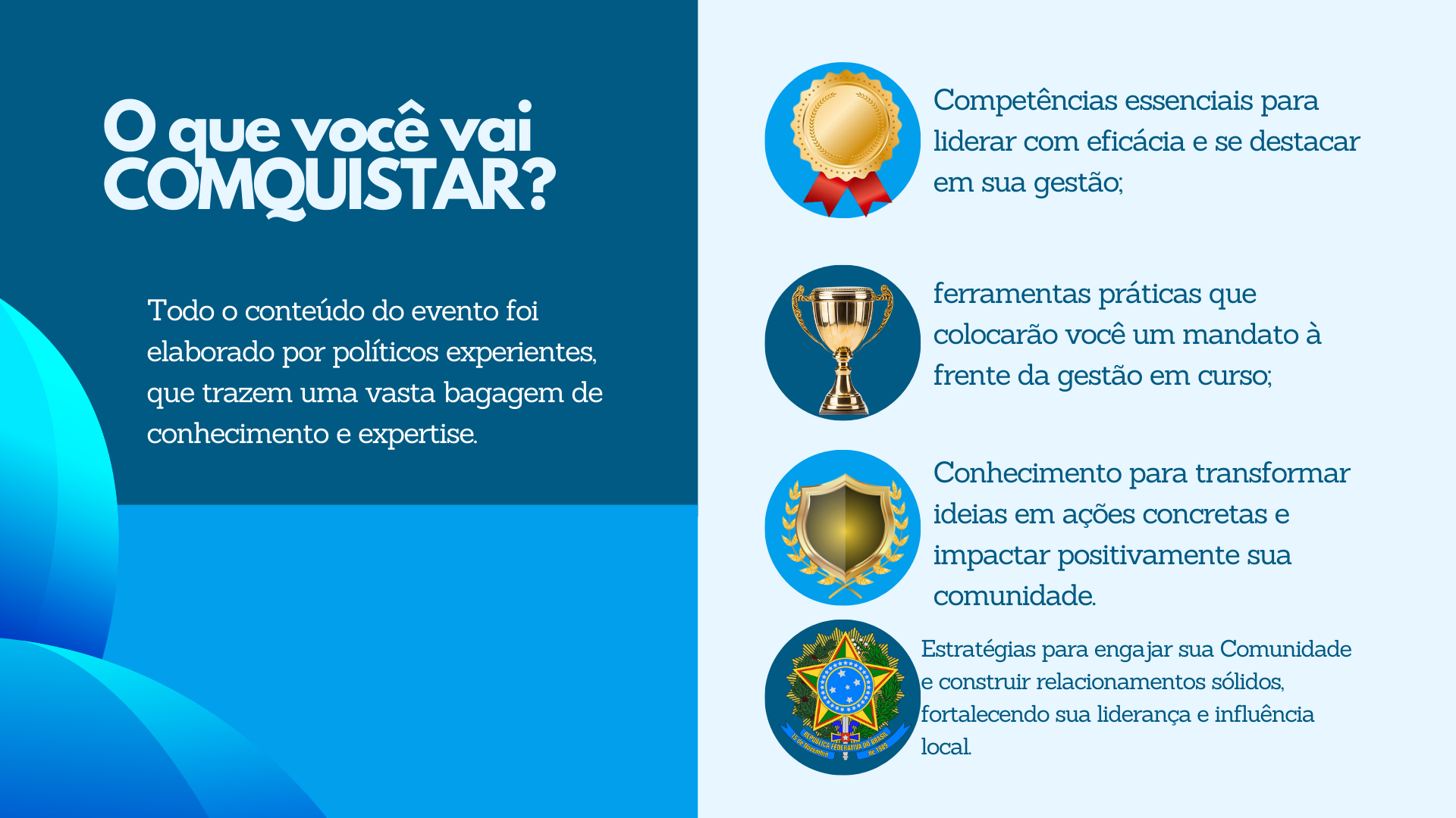 CONQUISTE: - Competências essenciais para liderar com eficácia e se destacar em sua gestão; - Ferramentas práticas que colocarão você um mandato à frente da gestão em curso;